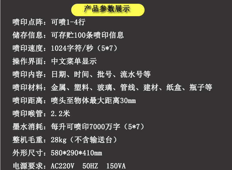 喷印字符包括中英文字符、阿拉伯数字、批号、标点符号及各种特殊图形